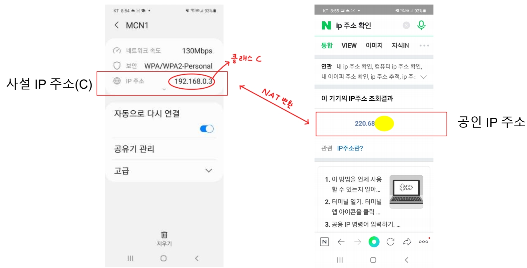 - 인터넷을 접속할 때마다 사설 IP 주소와 공인 IP 주소 간의 변환 수행