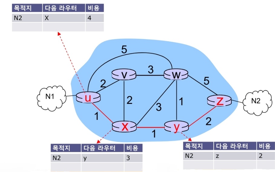 - 최소 비용 경로 상의 다음 라우터의 주소를 라우팅 테이블에 저장한다.