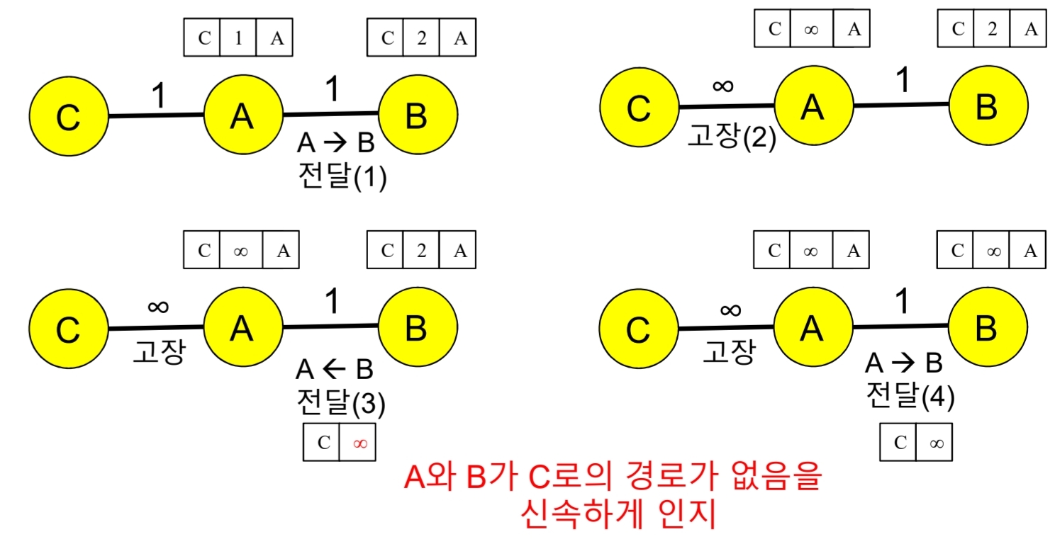 - 상대방 이웃 라우터를 경유하는 최소 경로 비용을 ∞로 변경하여 통보