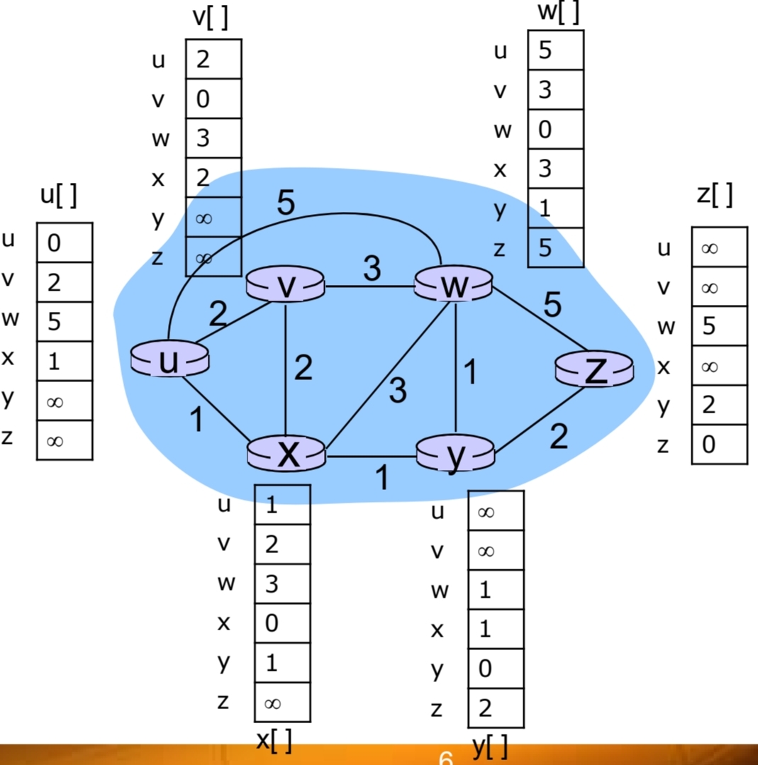 - Dxy = minv{c(x, v) + Dvy}, v는 x의 모든 이웃 라우터