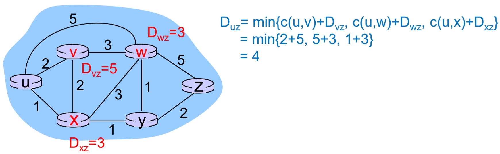 - Duz = mink{Duz, c(u, k) + Dkz}, k는 u의 모든 이웃 라우터