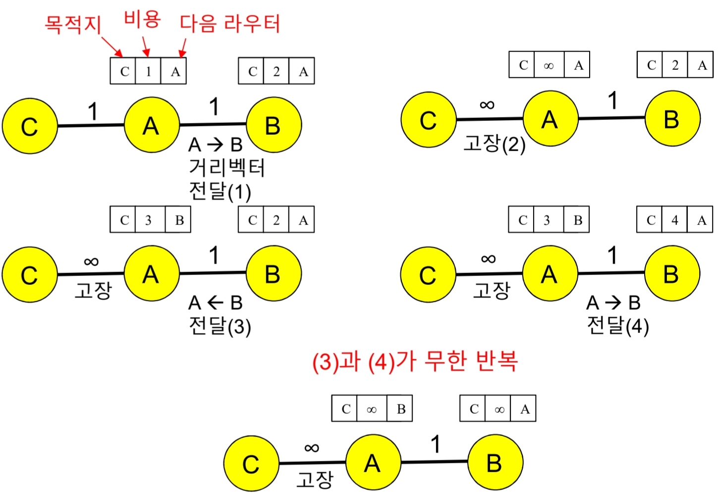 - 이웃 라우터를 경유하는 경로로 최소 경로 비용을 갱신하고, 해당 이웃 라우터에게 다시 전송하는 과정이 반복되는 문제