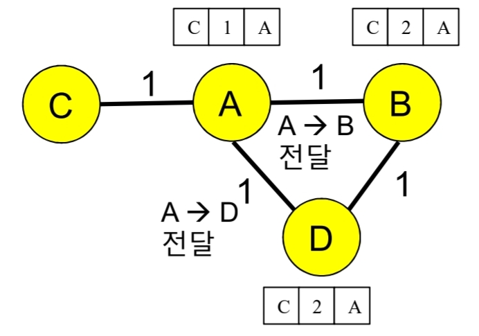 - 갱신된 거리 벡터를 이웃 라우터에 전달