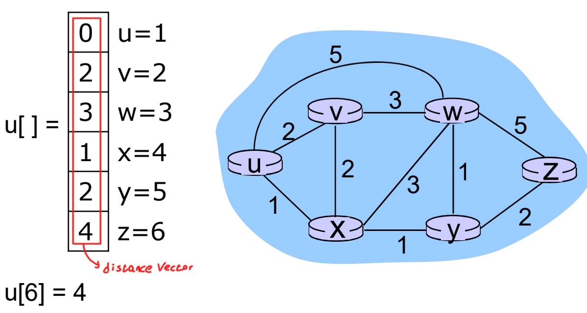 - u[x]: 라우터 u에서 라우터 x까지 거리(최소 경로 비용), 네트워크의 각 라우터가 거리 벡터의 인덱스