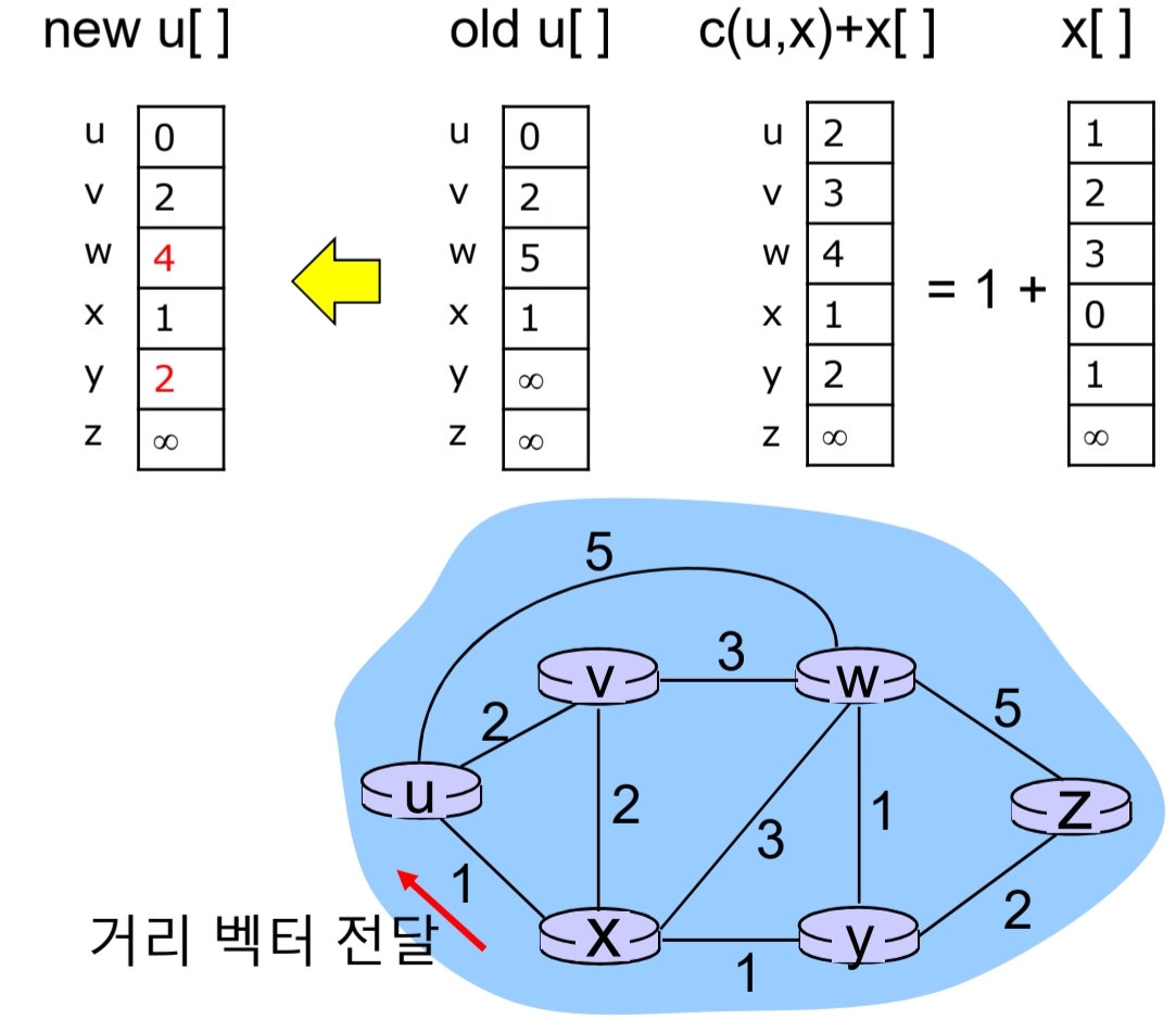 거리 벡터 공유를 통한 거리 벡터 갱신: x → u로 거리 벡터 전달