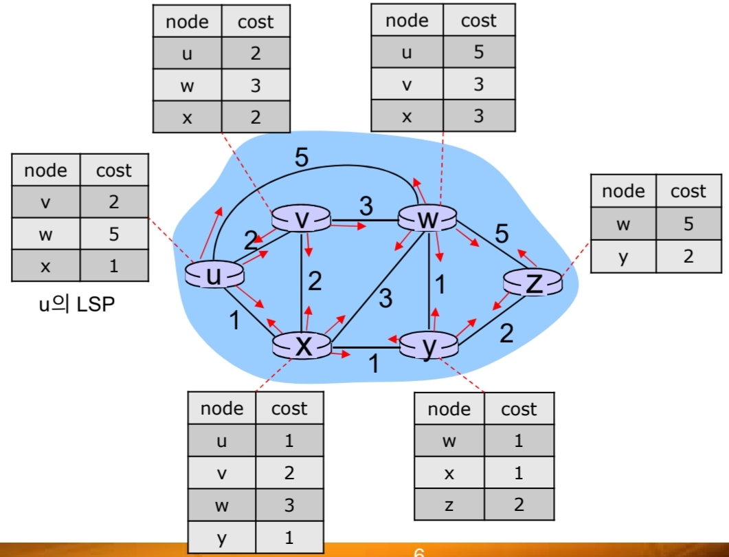 - 각 라우터가 다익스트라 알고리즘을 수행하여 전체 k개의 목적지 라우터에 대한 최소 비용 경로와 다음 라우터를 계산한다.
