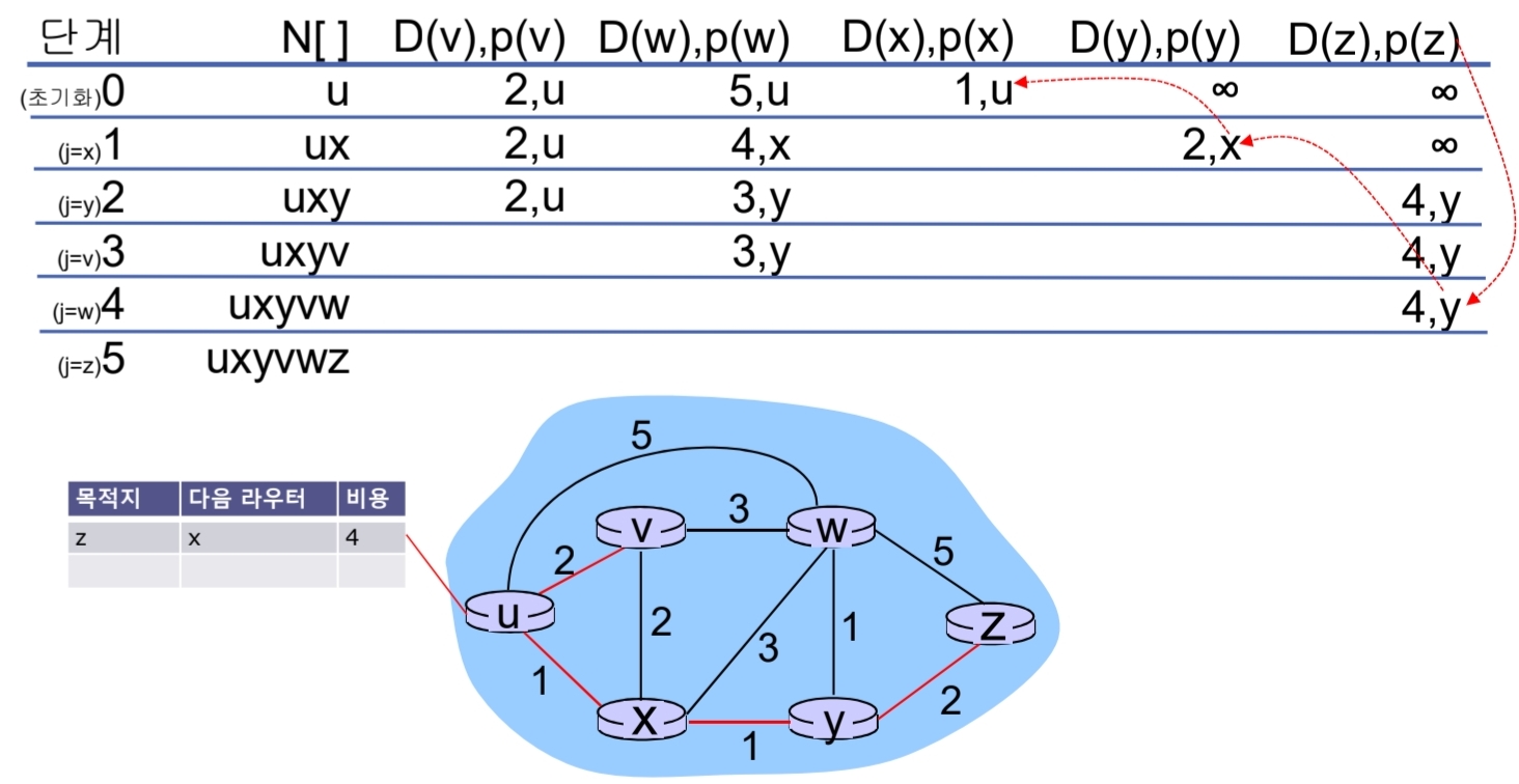 - 라우터 j와 인접한 모든 라우터 중에 N[ ]에 포함되지 않은 라우터 k에 대해 D(k) = min{D(k), D(j) + C(j, k)}로 갱신