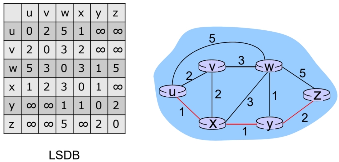 - C(i, j): 라우터 i에서 라우터 j까지의 링크 비용, 라우터 i와 라우터 j가 직접 연결되지 않았으면 C(i, j) = ∞