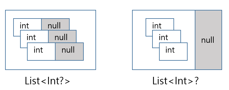 List<Int?>는 Int? 타입의 값을 저장할 수 있는데, 이는 그 리스트에 Int나 null을 저장할 수 있다는 것이다.