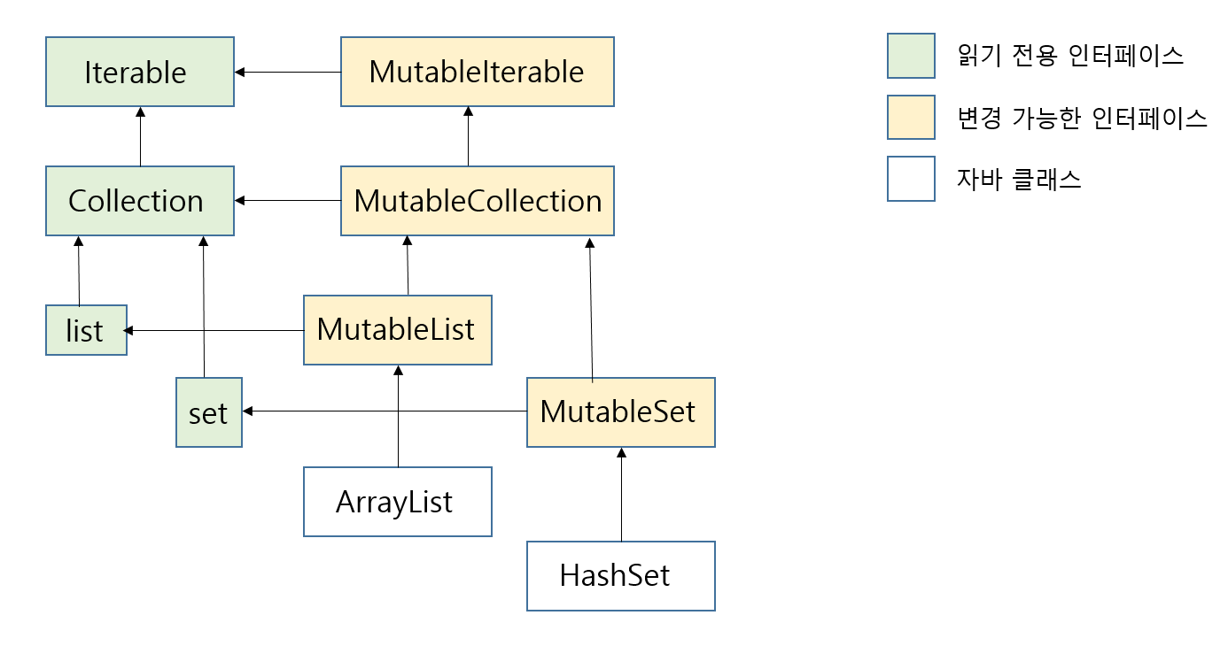 코틀린의 읽기 전용과 변경 가능 인터페이스의 기본 구조는 java.util 패키지에 있는 자바 컬렉션 인터페이스의 구조를