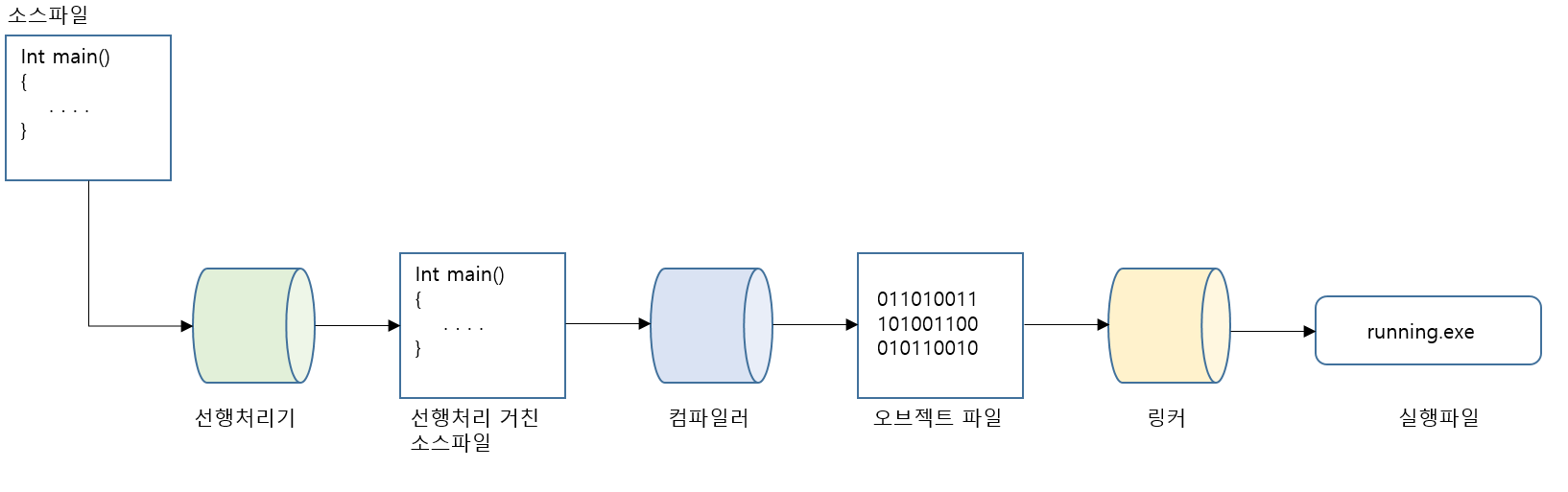 선행처리는 선행처리기에 의해, 컴파일은 컴파일러에 의해, 링크는 링커에 의해 진행이 된다.