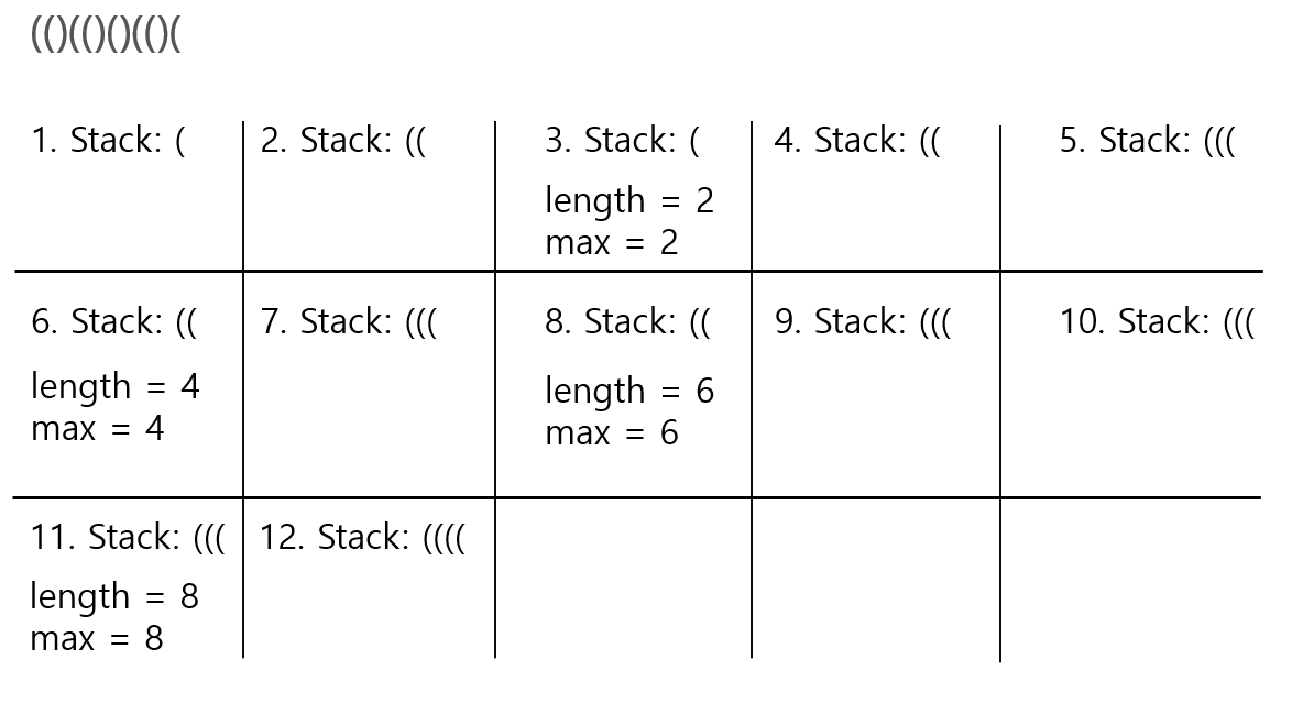 - ")"이며 Stack이 비어있지 않다면 길이에 2를 더한 후 max 값을 갱신한다.
