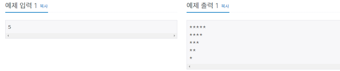 첫째 줄에는 별 N개, 둘째 줄에는 별 N-1개, ..., N번째 줄에는 별 1개를 찍는 문제