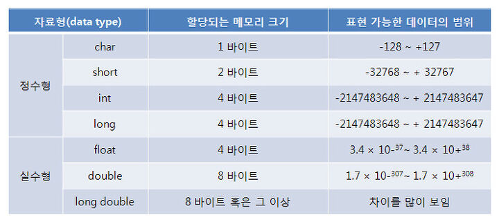 위의 사진을 보면 같은 정수 또는 실수 자료형이라도 사용되는 바이트 크기가 클수록 표현할 수 있는 값의 범위가 넓어진다.