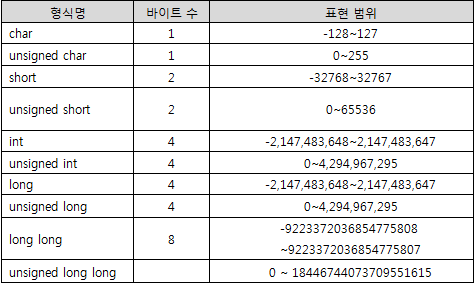 예를 들어 char형 변수의 앞에 unsigned를 붙여 unsigned char가 되면 표현할 수 있는 범위가 0 이상 +255 이하가 되는 것이다.