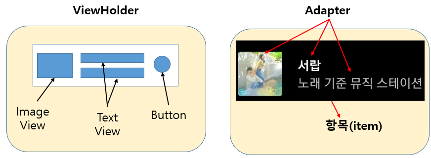 - ViewHolder : 항목에 필요한 뷰 객체를 갖는다.